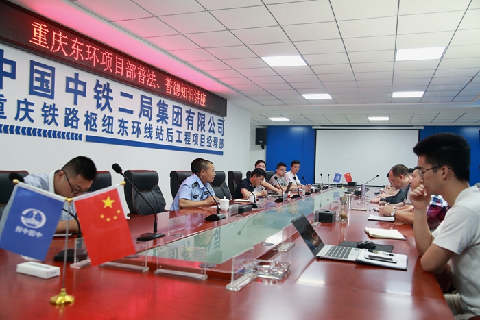 为了增强项目部群众依法治国的法律意识,提升大家知法、懂法、用法的能力,了解当地的治安政策,7月31日,重庆东环项目部邀请项目部所在地迎龙镇派出所两位警官到项目部现身说法。