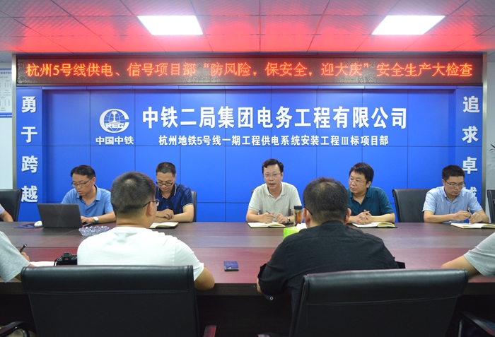 为贯彻党中央、国务院关于安全生产工作决策部署,吸取近期事故教训,推进“管”“监”责任落实,9月10日下午,公司副总经理王朝辉带领公司第五检查小组对杭州5号线供电和信号项目部进行“防风险,保安全,迎大庆”安全生产大检查。