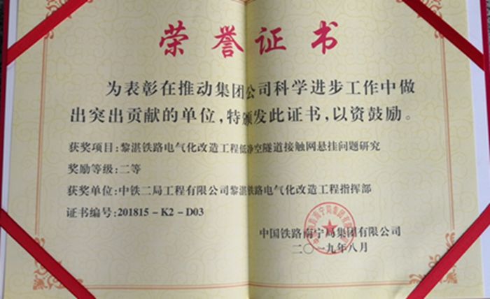 黎湛铁路电气化改造工程低净空隧道接触网悬挂问题研究,日前,获得南宁局集团公司科学进步二等奖表彰。
