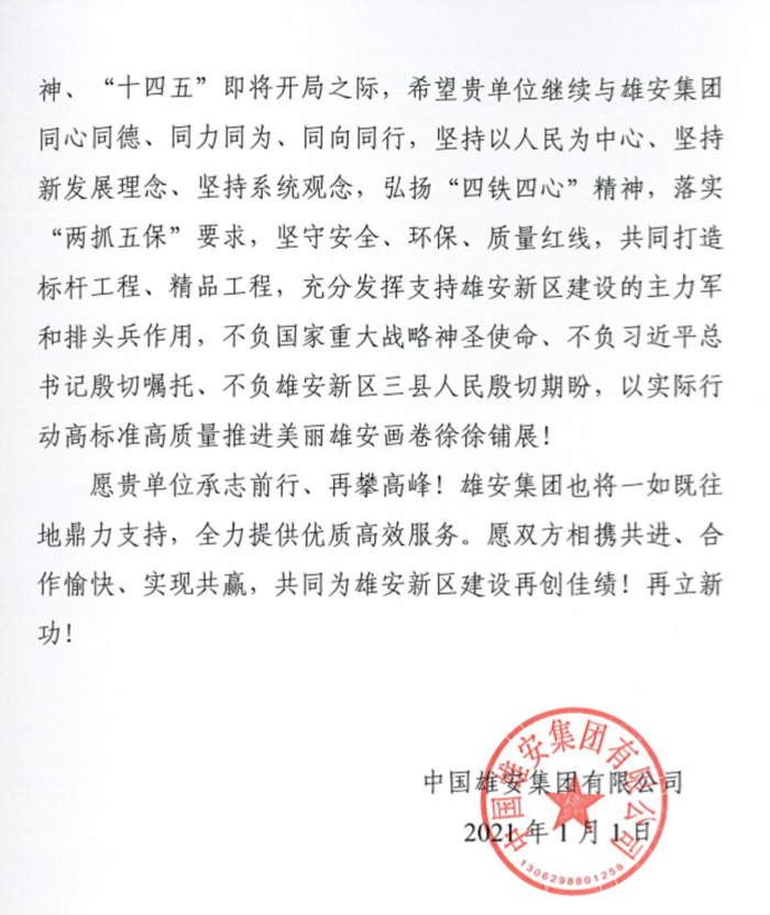 2021年元旦,智能化分公司雄安项目部收到来自业主方中国雄安集团有限公司致中铁二局集团有限公司的感谢信,对中铁二局电务公司雄安站机电安装项目部在配合保障2020年12月27日京雄城际铁路如期全线开通运营、雄安站正式投入使用、按照业主计划顺利完成有关工序、为雄安站配套建设奠定坚实的基础等所作出的积极贡献表示衷心的感谢。