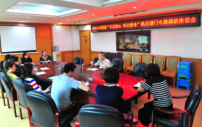 为扎实开展第二批“不忘初心 牢记使命”主题教育,认真贯彻“守初心、担使命,找差距、抓落实”的总体要求,结合中央“不忘初心、牢记使命”主题教育领导小组印发《关于开展第二批“不忘初心、牢记使命”主题教育的指导意见》要求,公司党委靠前组织,提前谋划,率先组织公司机关部门召开主题教育调研座谈会,广泛听取机关职工的意见和建议,切实把各类问题查准查深查实,确保主题教育抓检视问题到位、抓整改落实到位。自9月2日起,公司党委书记郭胜先后组织公司办公室、社会事业中心、技术中心、财务部、物设部、成本部等部门员工开展了调研座谈。