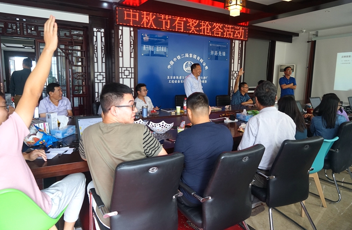 “欢度中秋”活动分上、下午两个时间段进行。上午10:00,全体员工观看中铁二局成昆铁路建设视频,视频讲述了老一辈二局人在成昆铁路建设中遇到的艰难险阻和他们不畏生死、全身投入的奉献精神,引发了所有人的情感共鸣。接着进行答题挑战赛,挑战赛设置4道与“不忘初心,牢记使命”主题教育、当前中国社会形势和平西府大修厂专业息息相关的必答题,答对方可进行第二轮。第二轮为选择题,答对进行下一题,答错则淘汰。过程中员工积极作答,发散思维,经过一番角逐,最终产生了1名一等奖、2名二等奖、3名三等奖。项目常务副经理经理杨承明、项目书记杨晓东、项目总工汪中正分别为其颁发奖品。