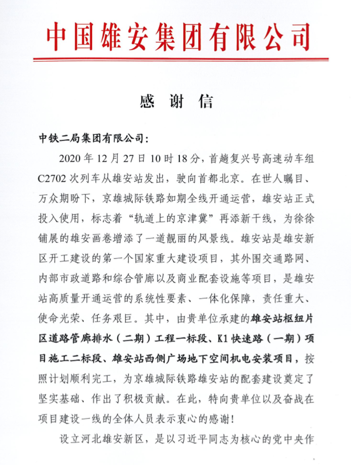 2021年元旦,智能化分公司雄安项目部收到来自业主方中国雄安集团有限公司致中铁二局集团有限公司的感谢信,对中铁二局电务公司雄安站机电安装项目部在配合保障2020年12月27日京雄城际铁路如期全线开通运营、雄安站正式投入使用、按照业主计划顺利完成有关工序、为雄安站配套建设奠定坚实的基础等所作出的积极贡献表示衷心的感谢。
